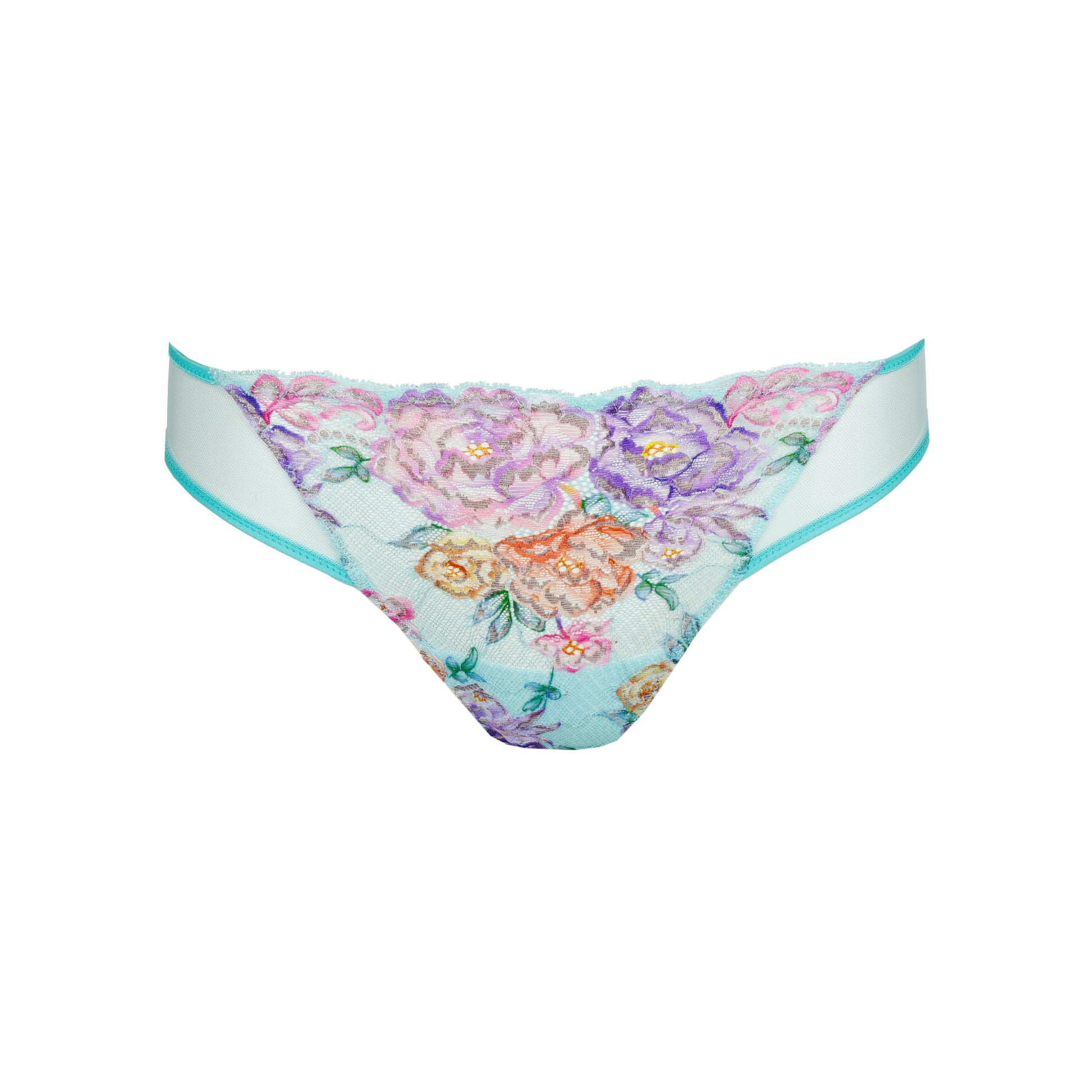 Brazilian-Slip mit elegantem Schnitt und bequemer Passform. Gewagtes Türkis mit rosa Blüten