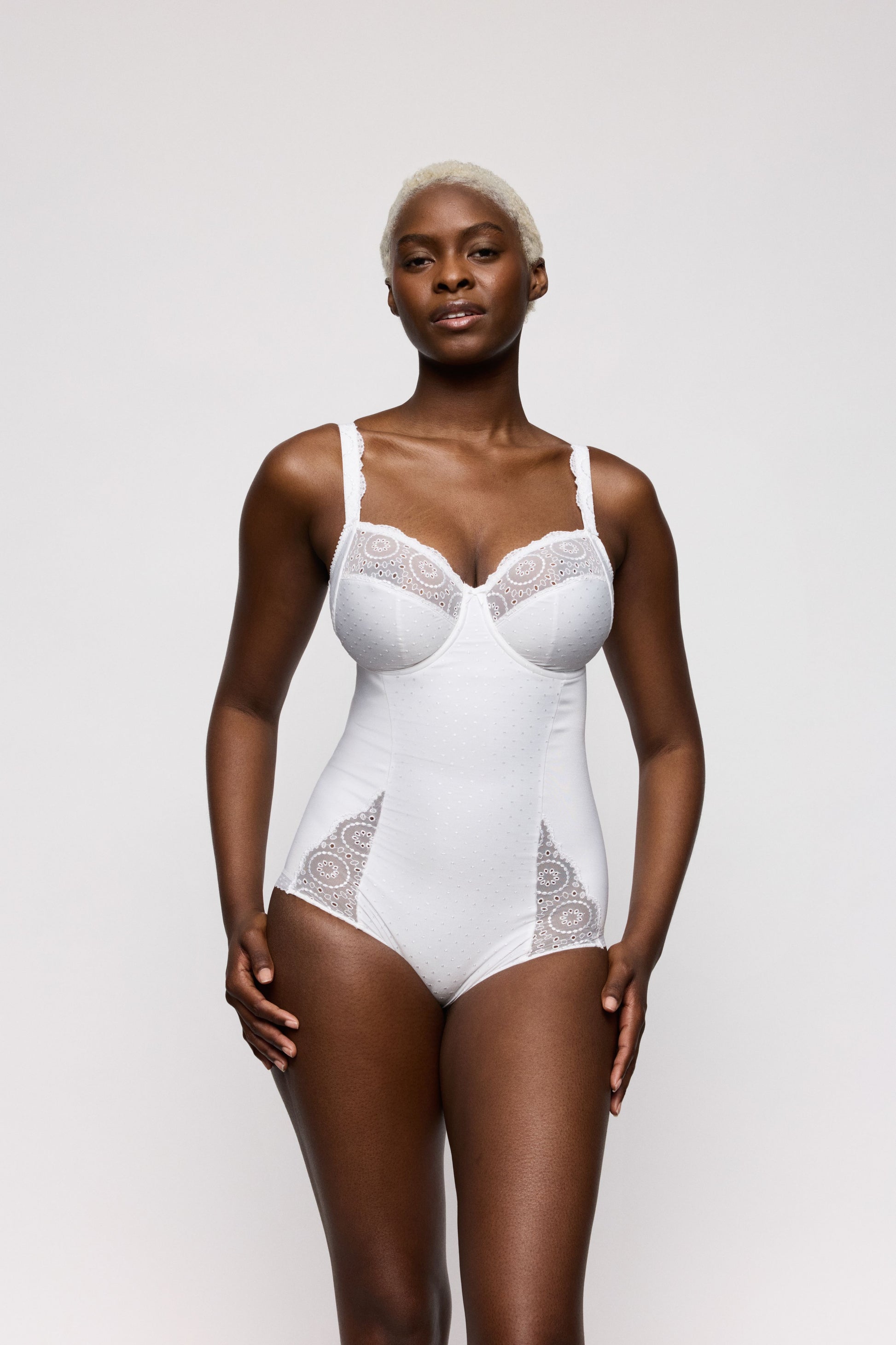 Ansprechender Body mit feiner Lochstickerei an den Beinen und am Dekolleté sowie mit leicht glänzendem Tupfenmull am Rumpf. An den Beinen flach verarbeitet, sodass sich unter der Kleidung nichts abzeichnet. Zeitloser Vintagelook in Weiß.